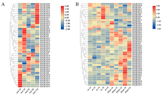 Transcriptome data from different developmental stages of daylily were analyzed to understand HcGRAS genes’ expression patterns (Figure 10A). Certain HcGRAS genes exhibited a consistent pattern of high expression at various flower development stages, including HcGRAS21, HcGRAS2, HcGRAS77, HcGRAS18, HcGRAS6, and HcGRAS1. Each OS19 subfamily member exhibited high expression at different stages, but there were great differences in the number of transcripts from members of other subfamilies. An example is that the SCL32 subfamily’s HcGRAS61 almost cannot be detected in transcripts, with the overexpression of other members. The SCL8 subfamily’s HcGRAS25 was highly expressed at the flower stages A to D.