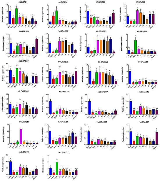Expression analysis of HcGRASs in different tissues. Different lowercase letters indicate significant differences by LSD (p < 0.05).