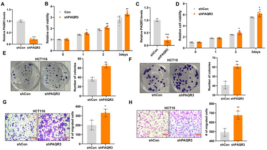 To investigate the functional impact of PAQR3 knockdown in colon cancer cells, we successfully established stable PAQR3 knockdown (shPAQR3) and control (shCon) cell models (Figure 1A,C). CCK8 assays demonstrated that the downregulation of PAQR3 expression significantly enhanced the viability of both HCT116 (Figure 1B) and HCT15 (Figure 1D) cells. Furthermore, colony formation assays confirmed these results, indicating an increase in the number of colonies that were formed in both colon cancer cell lines following PAQR3 knockdown (Figure 1E,F). Additionally, migration assays revealed that the knockdown of PAQR3 also elevated the migratory potential of HCT116 (Figure 1G) and HCT15 (Figure 1H) cells.