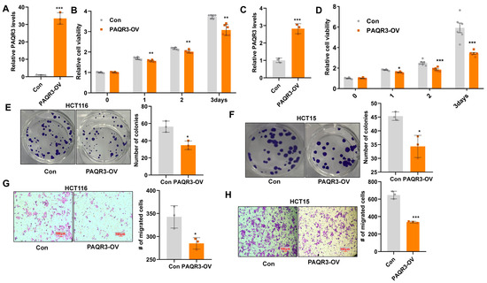 PAQR3 overexpression inhibits the proliferation and migration of colon cancer cells. (A) PAQR3 overexpression (PAQR3-OV) was achieved in HCT116 cells using lentiviral infection, with a corresponding control (Con) group being established. The efficiency of PAQR3 overexpression was evaluated via qRT-PCR. (B) After stable overexpression of PAQR3 in HCT116 cells, the stable cell line of A was seeded into 96-well plates, and the cell viability within 3 days was detected via CCK8 assay at a wavelength of 450 nm. (C) Stable cell lines with PAQR3 overexpression in HCT15 cells were constructed using the method described in A, and the expression efficiency of PAQR3 after stable overexpression in HCT15 cells was detected using qRT-PCR. (D) Changes in cell viability following PAQR3 overexpression in HCT15 cells were assessed at a wavelength of 450 nm through CCK8 assay. (E,F) The clonogenic ability of stably PAQR3-overexpressing HCT116 (E) and HCT15 (F) cell lines was assessed two weeks after inoculation. Representative images are displayed, with the number of clones quantified on the right. (G,H) The effect of PAQR3 overexpression on cell migration ability was determined using the transwell method. After stable overexpression of PAQR3 in HCT116 (G) and HCT15 (H) cells, cells were seeded into the upper chamber, and the cells that migrated to the lower chamber were fixed with paraformaldehyde for 20 min and stained with crystal violet for 20 min. After scrubbing, the number of cells migrating from the upper chamber to the lower chamber was determined under a microscope. Representative images are shown, along with statistical data for the number of migrating cells presented on the right. * indicates p < 0.05, ** indicates p < 0.01, and *** indicates p < 0.001.