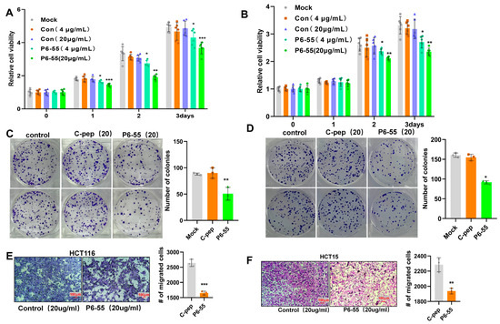 P6-55 inhibits the proliferation and migration of colon cancer cells. (A,B) HCT116 (A) and HCT15 (B) cells were treated with a control peptide or P6-55 for the indicated time periods, and cell viability was assessed using the CCK8 assay. (C,D) Colony formation was evaluated after treating HCT116 (C) and HCT15 (D) cells with a control peptide or P6-55 for 2 weeks, as demonstrated through crystal violet staining. Representative images are displayed, with the number of colonies quantified on the right. (E,F) The migration ability of the cells was tested using the transwell assay after treatment with a control peptide or P6-55. Representative images of migrating cells are shown, along with the statistical data for the number of migrating cells, presented on the right. * indicates p < 0.05, ** indicates p < 0.01, and *** indicates p < 0.001.