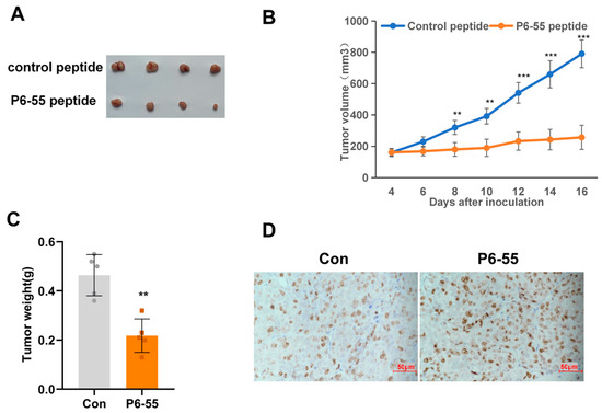 P6-55 inhibits the growth of colon cancer in a nude mouse tumor model. (A) HCT15 cells were injected subcutaneously into the right dorsal region of the mice in an equal number. When the tumor volume reached approximately 100 mm3, the mice were randomly divided into two groups. Both the control peptide and P6-55 were diluted with 50 μL of PBS at a dose of 100 mg, and each group received injections of either the control peptide or P6-55 every day. After 16 days of treatment, the tumors were excised and photographed. (B) The volume measurements of the tumors from mice treated with control peptide versus P6-55. (C) The weight measurements of the excised tumors from both treatment groups. (D) Immunohistochemical staining of Ki67 in paraffin-embedded sections of the tumor tissue shown in the subfigure (scale bar, 50 µm). ** indicates p < 0.01, and *** indicates p < 0.001.