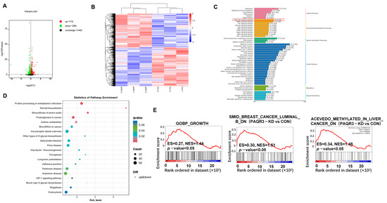 To explore the tumor-suppressive mechanisms of PAQR3 in colon cancer, we performed RNA sequencing to compare the HCT15 stable cell line with PAQR3 knockdown with corresponding control cell lines. From the sequencing results following PAQR3 knockdown, a volcano plot was produced, which indicates that 1119 genes were upregulated, while 1289 genes were downregulated (Figure 5A). Furthermore, a heat map was produced, which visually represents the expression distribution of differential genes across the three control groups and the experimental groups, with red areas indicating high expression levels and blue areas indicating low expression levels (Figure 5B). We subsequently used the KEGG classification map to functionally annotate the differentially expressed genes and found that after PAQR3 knockdown, 45, 43, and 34 differential genes were significantly enriched in the key signaling pathways of PI3K-AKT, MAPK, and Ras, respectively. Additionally, 81 genes were closely associated with tumor-related pathways, while 38 genes were related to thermogenic pathways (Figure 5C and Figure S3). The KEGG bubble plot further illustrates that after PAQR3 knockdown, the differential genes were predominantly concentrated in processes such as protein processing, cholesterol biosynthesis, and amino acid metabolism (Figure 5D). Finally, GSEA indicated that after PAQR3 knockdown, growth- and tumor-related pathways exhibited an upregulation trend, providing new insights and a foundation for understanding the tumor-suppressive role of PAQR3 in colon cancer (Figure 5E).