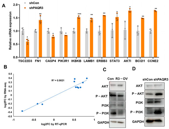 Given that the KEGG classification diagram indicated significant enrichment of the PI3K-AKT signaling pathway following PAQR3 knockdown, we further explored whether PAQR3 knockdown regulates this pathway, thereby influencing tumor growth. To this end, we selected 11 genes that are closely associated with the PI3K-AKT signaling pathway for detailed analysis (Figure 6A). Comparing normal HCT15 stable cell lines and ones with PAQR3 knockdown using qRT-PCR, we found that the expression of AKT1, a core component of the PI3K-AKT pathway, along with the oncogenes IKBKB and STAT3, was significantly increased [19,20,21,22,23,24]. In contrast, the expression levels of the tumor suppressor PIK3R1 and the transcription regulator TSC22D3 were inhibited. Notably, TSC22D3 not only regulates cell growth, differentiation, and immune responses but may also partially inhibit anti-tumor immune responses [25]. PIK3R1, as a critical component of the PI3K-AKT pathway, is essential for cell growth, division, and other vital functions, and its expression also exhibited a downward trend following PAQR3 knockdown [26,27]. Additionally, we observed that the expressions of the cell adhesion-related genes FN1 and LAMB1 were upregulated after PAQR3 knockdown, aligning with the biological function of PAQR3 as a tumor suppressor gene [28,29,30]. The anti-apoptotic protein BCL2L1 and the pro-apoptotic CASP4, which play pivotal roles in cell survival and DNA damage response, showed expected changes, with increased BCL2L1 and decreased CASP4 levels being associated with PAQR3 knockdown [31,32,33]. The expression of the cell cycle-related gene CCNE2 was also increased, as anticipated [34,35]. Moreover, ERBB3—a receptor tyrosine kinase which is frequently overexpressed in various tumors and involved in cell proliferation and migration—demonstrated increased expression following PAQR3 knockdown [36]. In addition, we also established PAQR3-overexpressing and corresponding control cell lines in SW480 cells and found that PAQR3 significantly inhibited the PI3K-AKT signaling pathway (Figure S4).