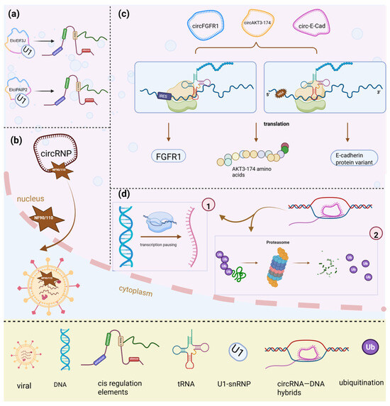 Figure 2. The other mechanism of circRNAs in physiological and pathological conditions. (a) EIciEIF3J and EIciPAIP2 promote EIF3J and PAIP2 gene transcription by recruiting U1 snRNP in cis. (b) CircRNP, composed of NF90/NF110, releases NF90/NF110 upon stimulation, allowing its binding to viral mRNA and promoting antiviral immunity. (c) CircFGFR1, circAKT3-174, and circ-E-cad encode proteins FGFR1, AKT3-174, and C-E-cad, respectively, through IRES- and m6A-mediated cap-independent translation. (d) CircSMARCA5 interacts with its parental gene locus, forming an R-loop contributing to transcriptional pausing and proteasome inhibition; IRES, internal ribosome entry site; m6A, N6-methyladenosine; U1-snRNP, U1 small nuclear ribonucleoprotein.