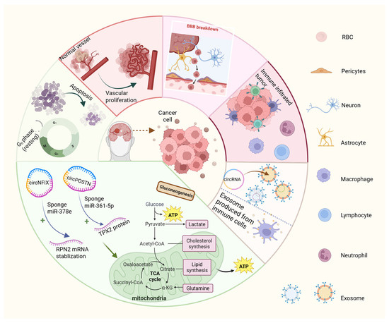 In addition to influencing tumor energy metabolism, circRNAs are also involved in regulating the permeability and integrity of the blood–brain barrier (BBB) [57]. The BBB is a critical component of the central nervous system (CNS) that provides regular physiological function and high stability of the CNS’s activities [58]. The absence of fenestrations in the BBB due to its continuous tight junctions substantially restricts the movement of neurotoxic molecules (viruses, inflammatory factors, and heavy metals) via the endothelial cell layer [59]. However, this also restricts the drug’s ability to reach the brain. Recent evidence indicates that gliomas not only facilitate BBB remodeling but also contribute to the formation of BTB [60]. Glioma endothelial cells (GECs) act as the main structural component of the BTB, which is highly heterogeneous and exhibits distinct features, including non-uniform permeability, active efflux of molecules, and restricted delivery of antitumor drugs to glioma tissues. Although the BTB is considered ‘leakier’ than the BBB [15], it retains key characteristics of the BBB, such as the expression of active efflux transporters in endothelial and tumor cells [61]. These findings suggest that the BTB represents a compromised form of the BBB [62].