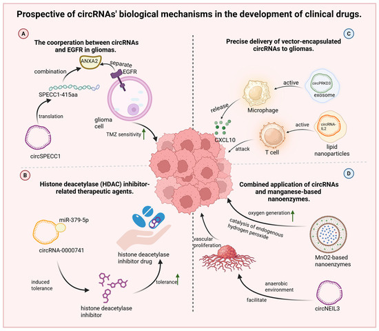 Figure 4. Prospective of circRNAs’ biological mechanisms in the development of clinical drugs. (A) CircSPECC1 can translate SPECC1 amino acid, which competitively binds annexin A2 protein, disrupting the binding of ANXA2 to EGFR and recovering the TMZ sensitivity of gliomas. (B) CircRNA-0000741, overexpressed in gliomas, can induce tolerance and impair HDAC inhibitor sensibility via sponging miR-379-5p. (C) Exosomemal circPRKD3 promotes tumor-associated macrophages secreting CXCL10; lipid nanoparticles loaded with circRNAs are inserted into the IL-2 coding sequence, which activates the proliferation of CD8+ T-cells and attracts cancer cells. (D) MnO2 nanoenzymes promote the generation of O2 from endogenous hydrogen peroxide (H2O2) in tumor tissues; circNEIL3 plays a role in promoting angiogenesis in tumor tissues in anaerobic environment. ↑, it represents the meaning of elevation and promotion.