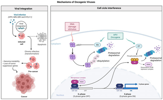 Figure 1. (Left) Viral integration into the host genome, as observed in HPV, HBV, EBV, and HTLV-1, can lead to chronic infection, genomic instability, and the disruption of tumor suppressor genes, favoring malignant transformation. (Right) In HPV-driven carcinogenesis, the E6 oncoprotein promotes proteasomal degradation of p53 via ubiquitination, impairing DNA damage response and apoptosis. Concurrently, E7 inactivates the retinoblastoma protein (pRb), releasing E2F transcription factors and enabling uncontrolled progression to the S phase. Both proteins contribute to cell cycle deregulation and tumor development through interference with chromatin regulators such as HDACs. Created using BioRender.