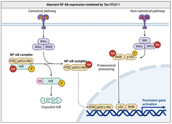Figure 2. Constitutive activation of the canonical and non-canonical NF-κB signaling pathways promoted by the viral protein Tax. In the canonical pathway, Tax interacts with the IKK complex (IKKα, IKKβ, IKKγ), promoting the phosphorylation, ubiquitination, and subsequent degradation of IκB, releasing the NF-κB complex (p50/p65/c-Rel) for nuclear translocation and gene activation. In the non-canonical pathway, Tax stimulates the activation of NIK and IKKα, promoting the phosphorylation of the p100 protein bound to RelB. This leads to the proteasomal processing of p100 into p52, allowing the formation of the RelB/p52 complex, which also migrates to the nucleus and activates the transcription of target genes. Both pathways converge at the persistent activation of pro-proliferative and anti-apoptotic genes, which is characteristic of HTLV-1-induced cellular transformation. Created using BioRender.