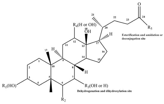 Gut microbiota enzymatically transform primary BAs in the colon via multi-step modifications including deconjugation, structural rearrangement (7α/β-dehydroxylation and oxidation/epimerization), and reconjugation processes (Figure 2). These microbial modifications not only enhance the structural diversity of BAs (as illustrated by their general structure in Figure 3) but also increase the overall hydrophobicity of the BA pool, thereby influencing their physiological functions.
