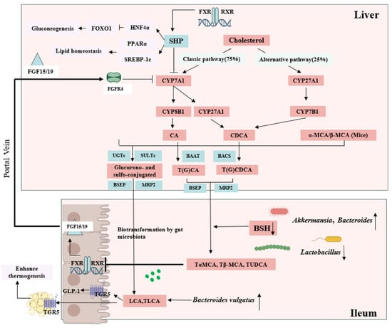 Studies indicate that disruption of BA homeostasis or related signaling pathways can lead to cholestasis, hepatobiliary injury, and metabolic dysregulation [84]. BA homeostasis is predominantly sustained through negative feedback mechanisms and spatiotemporally regulated enterohepatic circulation. The regulation of BA synthesis, primarily governed by the activation of FXR in both hepatic and intestinal tissues, detects BA concentrations and modulates the transcription of genes associated with BA synthesis, conversion, transport, and signaling pathways [85]. Upon reabsorption in the ileum, BAs activate intestinal FXR, thereby stimulating the hepatic synthesis of the small heterodimer partner (SHP) protein and FGF19. FGF19, along with reabsorbed BAs, enters the portal circulation and suppresses hepatic BA synthesis, thereby maintaining BA pool homeostasis [86].