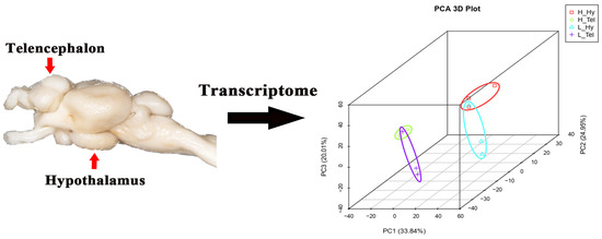 Principal component analysis (PCA) of transcriptomes from the telencephalon and hypothalamus of largemouth bass after crowding stress. H_Hy, high-density hypothalamus. H_Tel, high-density telencephalon. L_Hy, low-density hypothalamus. L_Tel, low-density telencephalon. The contribution ratios of the principal components (PC1, PC2, PC3) are displayed as percentage variance on the axis labels. Three biological replicates of each sample were grouped together and represented by one ellipse. Different-colored ellipses represent different groups.