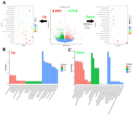 Functional classification of differentially expressed genes in the telencephalon of largemouth bass after crowding stress. (A) Volcano plot of differentially expressed genes and top 20 KEGG pathways enrichment based on upregulated/downregulated differential-expressed genes in the telencephalon between low- and high-density groups; (B) gene ontology (GO) enrichment analysis based on upregulated differential-expressed genes in the telencephalon between low- and high-density groups; (C) gene ontology (GO) enrichment analysis based on downregulated differential-expressed genes in the telencephalon between low- and high-density groups. Up, up-regulated differentially expressed genes (labeled with red upward arrow). Down, down-regulated differentially expressed genes (labeled with green downward arrow). BP, biological process. CC, cellular component. MF, molecular function. Top 10 GO terms in each of three groups have been listed in (B,C).