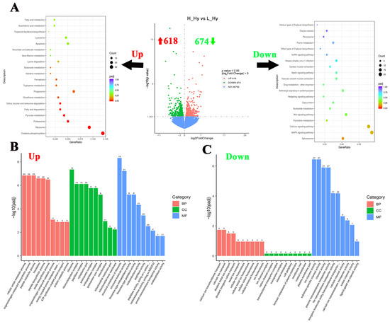 Functional classification of differentially expressed genes in the hypothalamus of largemouth bass after crowding stress. (A) Volcano plot of differentially expressed genes and top 20 KEGG pathways enrichment based on up-regulated/down-regulated differential-expressed genes in the hypothalamus between low- and high-density groups; (B) gene ontology (GO) enrichment analysis based on upregulated differential-expressed genes in the hypothalamus between low- and high-density groups; (C) gene ontology (GO) enrichment analysis based on downregulated differential-expressed genes in the hypothalamus between low- and high-density groups. Up, up-regulated differentially expressed genes (labeled with red upward arrow). Down, down-regulated differentially expressed genes (labeled with green downward arrow). BP, biological process. CC, cellular component. MF, molecular function. Top 10 GO terms in each of three groups have been listed in (B,C).