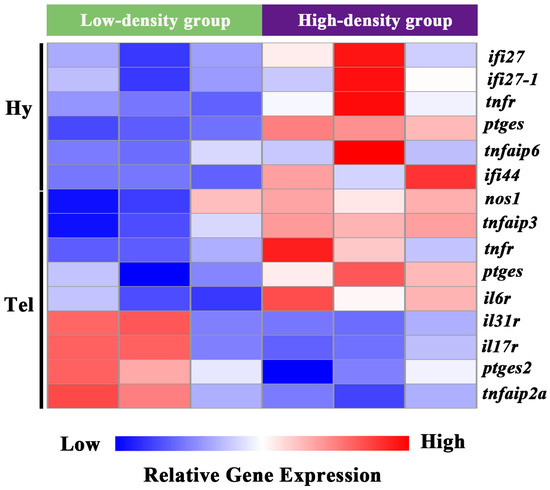 Clustering analysis of DEGs involved in inflammation process in the telencephalon and hypothalamus of largemouth bass after crowding stress. Hy, hypothalamus. Tel, telencephalon. ifi27, interferon alpha-inducible protein 27. ifi27-1, interferon alpha-inducible protein 27-1. tnfr, tumor necrosis factor receptor superfamily member. ptges, prostaglandin E synthase. tnfaip6, tumor necrosis factor alpha-induced protein 6. ifi44, interferon-induced protein 44. nos1, nitric oxide synthase 1. tnfaip3, tumor necrosis factor alpha-induced protein 3. il6r, interleukin-6 receptor. il31r, interleukin-31 receptor. il17r, interleukin 17 receptor. ptges2, prostaglandin E synthase 2. tnfaip2a, tumor necrosis factor alpha-induced protein 2a. Relative gene expression levels are represented by a color gradient: red represents gene expression up-regulation, blue represents gene expression down-regulation, and white indicates gene expression with non-significant changes.