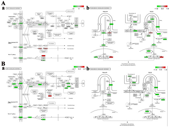 Region-specific dysregulation of Wnt and Hedgehog signaling pathways. (A) Telencephalon: (a) Wnt, (b) Hedgehog. (B) Hypothalamus: (a) Wnt, (b) Hedgehog. Relative gene expression levels of genes in each signaling pathway are represented by a color gradient: red represents gene expression up-regulation, green represents gene expression down-regulation, gray indicates gene expression with non-significant changes, and white denotes genes that are not identified in the transcriptome data.