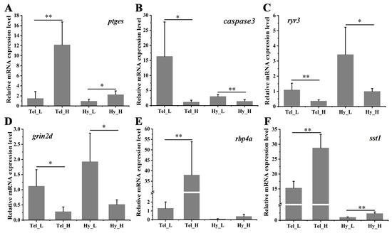Differential mRNA expression of selected genes in the telencephalon and hypothalamus after crowding stress. (A) Relative mRNA expression of prostaglandin E synthase (ptges); (B) Relative mRNA expression of cysteine-dependent aspartate-specific protease 3 (caspase 3); (C) Relative mRNA expression of ryanodine receptor 3 (ryr3); (D) Relative mRNA expression of glutamate receptor ionotropic, NMDA 2D (grin2d); (E) Relative mRNA expression of retinol-binding protein 4A (rbp4a); (F) Relative mRNA expression of somatostatin 1 (sst1). Tel_L, low-density telencephalon. Tel_H, high-density telencephalon. Hy_L, low-density hypothalamus. Hy_H, high-density hypothalamus. Data are presented as mean ± SD. Statistical significance was determined using SPSS (version 27.0), with p < 0.05 considered statistically significant (*), and p < 0.01 considered highly statistically significant (**).