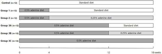 Male Sprague–Dawley rats (Koatech, Pyeongtaek, Gyeonggi-do, Republic of Korea) weighing 350–400 g were divided into six groups after a 1 wk acclimatization period. Two rats per cage were accommodated in a temperature- and humidity-controlled environment (18–20 °C at 30–70% humidity) with a 13–14-h light-dark cycle (130–325 lux). Standard and adenine diets were purchased from DooYeol Biotech (Seocho-gu, Seoul, Republic of Korea). Food and water were placed on the side of the rat’s cage, allowing for free access throughout the study period. The experimental protocols were approved by the Institutional Animal Care and Use Committee of Seoul National University Hospital (IACUC No. 24-0037-S1A0).