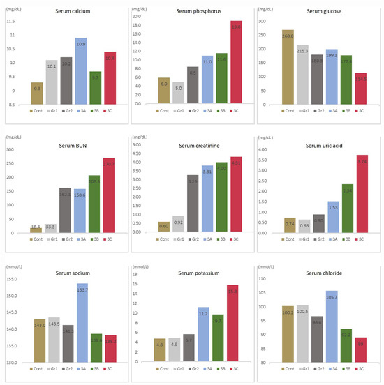 Serum calcium levels did not show significant differences among the groups at 18 wk, while serum phosphorus levels showed a significant difference between group 3C and the control group. Serum blood urea nitrogen (BUN) levels in groups 2, 3A, 3B, and 3C differed significantly from those in the control group. Serum BUN levels in groups 2, 3B, and 3C differed significantly from those in Group 1. Serum BUN levels in group 3C differed significantly from those in group 2. Serum creatinine levels in groups 2, 3A, 3B, and 3C differed significantly from those in the control group and group 1. Serum uric acid levels in group 3B differed significantly between the control group and group 1, whereas serum uric acid levels in group 3C differed significantly from those in the control group and in groups 1 and 2. Serum potassium levels in groups 3A, 3B, and 3C differed significantly from the control group and group 1, with group 3B also differing significantly from group 1. The serum chloride level in group 3B differed significantly from the control group and groups 1 and 2, while group 3C differed significantly from the control group and groups 1, 2, and 3A. Serum glucose and sodium levels did not differ significantly. No parameter differed significantly between groups 3B and 3C (Figure 3) (Supplementary Table S1).