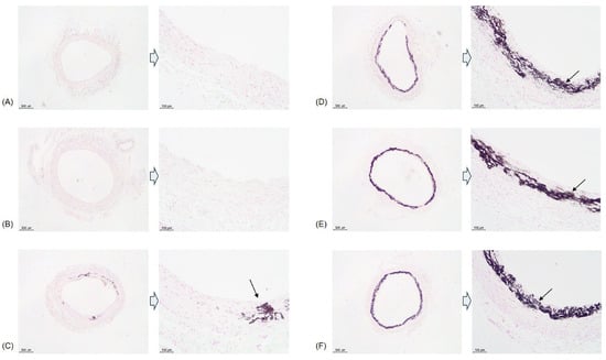 Examples of vascular calcification observed at 18 wk using von Kossa staining. No calcification was observed in the control group (A) and group 1 (B). Group 2 (C) showed mild calcification in the medial layer of the aorta. Groups 3A (D), 3B (E), and 3C (F) showed severe calcification. Arrows indicate vascular calcification.