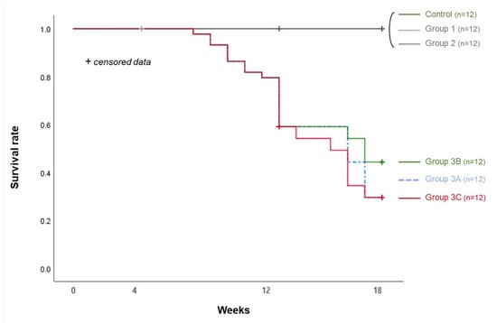 The statistical analyses were performed using the Statistical Package for Social Science, version 25 (IBM Corp., Armonk, NY, USA). The quantified data were presented as mean ± SD. The Kaplan–Meier method and log-rank test were used to compare survival rates between groups. Differences between groups were analyzed using a one-way analysis of variance followed by Scheffe’s post hoc test. Statistical significance was set at a 95% confidence level (p < 0.05).