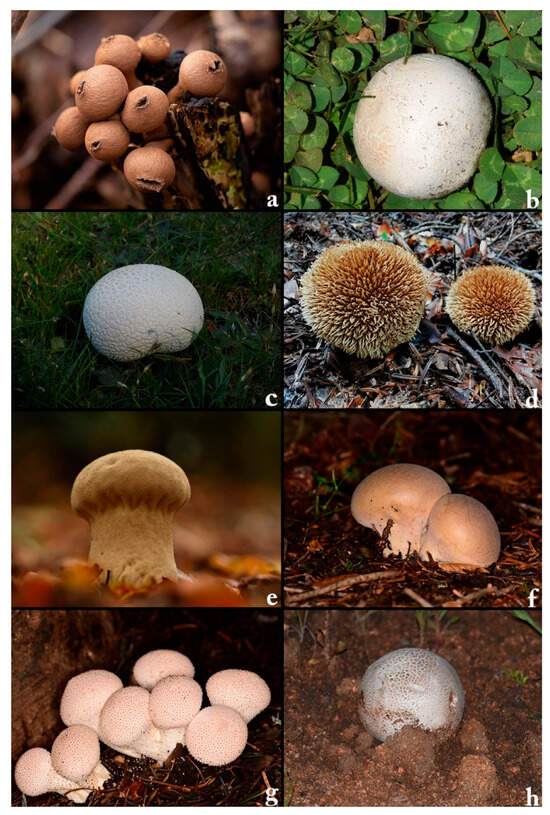 - Larsson, E.; Jeppson, M. Phylogenetic relationships among species and genera of Lycoperdaceae based on ITS and LSU sequence data from north European taxa. Mycol. Res. 2008, 112, 4–22. [Google Scholar] [CrossRef] [PubMed]