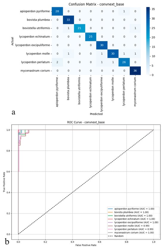 As illustrated in the confusion matrix (Figure 3a), the model shows highly effective classification capabilities. ConvNeXt-Base provides exceptionally accurate predictions for most species, with near-perfect classification achieved for Mycenastrum corium, Lycoperdon echinatum, Lycoperdon excipuliforme, and Bovista plumbea. While minor errors occur for Bovistella utriformis and Lycoperdon perlatum, these instances represent isolated cases rather than systematic misclassification patterns. Overall, the model maintains exceptionally low false positive and false negative rates, contributing to its reliable performance. The ROC analysis presented in the figure further supports these findings (Figure 3b); AUC values reach 0.99–1.00 across all species, indicating near-ideal class separation. The curves’ consistent positioning near the upper-left corner confirms the model’s strong discriminative power, even for morphologically similar or rarely encountered specimens. Collectively, these results establish ConvNeXt-Base as not only statistically superior but also practically dependable, delivering consistent, high-confidence predictions across all mushroom categories with minimal classification ambiguity.