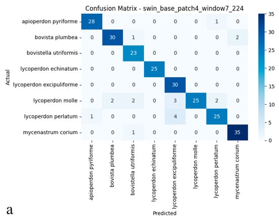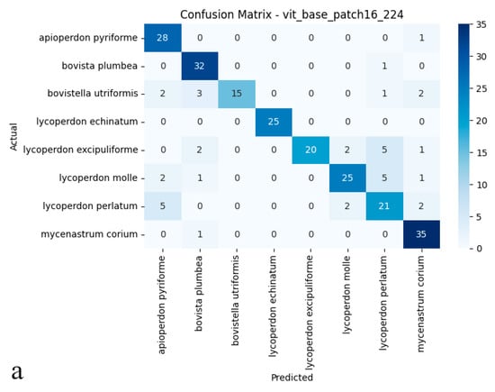 The Vision Transformer attained 83.75% test accuracy, establishing itself as a competitive alternative among the evaluated deep learning architectures. Its balanced performance metrics 0.86 precision and 0.83 recall reflect both reliable identification and consistent detection of true specimens, further supported by a 0.84 F1-score (Figure 4a,b). These results suggest that the Vision Transformer’s ability to model global image dependencies provides a viable approach for differentiating puffball species. However, its performance gap compared to ConvNeXt-Base (95.41% accuracy) implies that, for this particular dataset with its fine morphological distinctions between species, convolutional architectures may maintain an edge in practical applications.