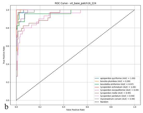 As shown in the confusion matrix (Figure 4a), the Vision Transformer (ViT) model achieved high classification rates for most puffball species. Notably, it demonstrated remarkable accuracy for Lycoperdon echinatum, Apioperdon pyriforme, and Mycenastrum corium, while an increased incidence of cross-class assignments was evident for certain classes. In particular, Bovistella utriformis and Lycoperdon excipuliforme showed a higher susceptibility to misclassification, indicating that the model found it more challenging to distinguish these species. Despite these challenges, the ViT model maintained a strong capacity to predict correctly the majority of examples, though a higher frequency of errors was apparent among morphologically similar species. The ROC analysis presented in the figure (Figure 4b) further substantiates these findings; the AUC values for many categories reached or exceeded 0.99, underscoring the model’s strong performance in terms of both sensitivity and specificity. However, slightly reduced AUC scores for Bovistella utriformis, Lycoperdon molle, and Lycoperdon perlatum suggest that the model encountered additional difficulties in differentiating positive from negative instances within these specific classes. Collectively, these results demonstrate that the Vision Transformer architecture delivers substantial discriminative power and overall reliability, yet its performance is occasionally limited by the morphological resemblance among certain species. In summary, while the ViT model exhibited promising results for multi-class biological image recognition, its performance variability was more pronounced than that of convolutional architectures, particularly in terms of maintaining uniformly high accuracy across all classes.