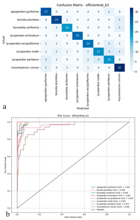 As depicted in the confusion matrix (Figure 5a), the EfficientNet-B3 model achieved high classification accuracy across various puffball species. The model excelled with taxa such as Apioperdon pyriforme, Bovista plumbea, and Lycoperdon echinatum. At the same time, more frequent cross-classification errors were observed between morphologically similar species, notably between L. molle and L. perlatum. A significant portion of Lycoperdon perlatum instances, for example, were misassigned to other classes, indicating areas where the model’s precision diminished. The ROC analysis presented in the figure (Figure 5b) further highlights these trends; the area under the curve (AUC) values for most classes approached 0.99 to 1.00, underscoring the model’s overall proficiency in distinguishing positive and negative instances. However, slightly reduced AUC scores for species such as Lycoperdon perlatum and Mycenastrum corium suggested weaker discriminative ability for these specific taxa. Collectively, these findings indicate that while EfficientNet-B3 offers robust discriminative power and reliable performance for clearly distinguishable species, its precision tends to decline when addressing classes with considerable morphological similarity. Although the model performs strongly overall, it is occasionally surpassed by deeper or transformer-based architectures in complex multi-class biological image recognition tasks.