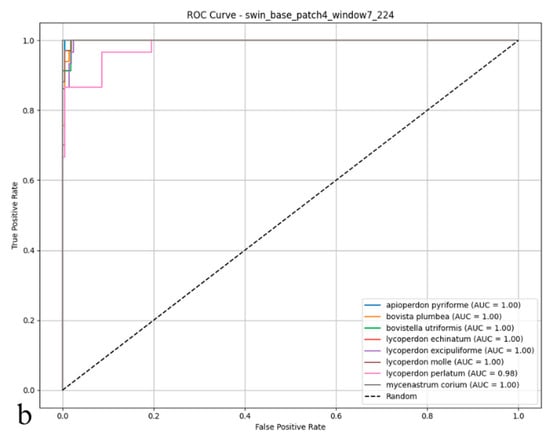 As illustrated in the confusion matrix (Figure 6a), the Swin Transformer model achieved near-flawless classification rates for species such as Mycenastrum corium, Lycoperdon echinatum, and L. excipuliforme, with only occasional misclassifications observed between L. perlatum and L. molle. Overall, error rates remained low, and the model maintained a balanced classification across all categories, underscoring its impressive accuracy and reliability. The ROC analysis presented in the figure (Figure 6b) further substantiates these results; most AUC values reached 0.99 or 1.00, indicating outstanding sensitivity and specificity across nearly all puffball species. The ROC curves’ close proximity to the upper-left corner highlights the model’s consistent ability to distinguish positive from negative cases. Discriminative performance was particularly strong for species including Apioperdon pyriforme, Bovista plumbea, Bovistella utriformis, Lycoperdon echinatum, L. excipuliforme, and Mycenastrum corium, where classification approached perfection. Only Lycoperdon perlatum and L. molle exhibited marginally lower AUC values, suggesting slightly greater difficulty in differentiating these species. Taken together, these findings confirm the Swin Transformer’s capacity for high-precision classification, reliable discrimination, and broad generalizability in complex biological image analysis. The model consistently delivers stable, trustworthy predictions, even when challenged by visually similar categories.
