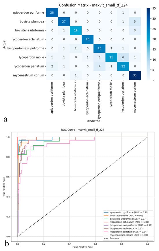 (a) Confusion matrix and (b) ROC curves with AUC values of the MaxViT (Small TF 224) model for each macrofungus species.