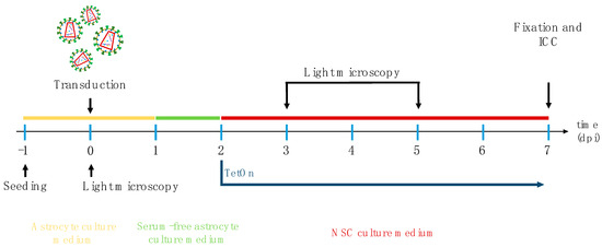 The following day (day 1, 24 h after lentiviral transduction), the medium was replaced with freshly prepared, pre-warmed (37 °C), and CO2-equilibrated serum-free astrocyte culture medium. Forty-eight hours post-transduction (day 2), the medium was changed to neural stem cell (NSC) medium (see Table 1), and expression of Oct4, Sox2, and Klf4 was induced by adding tetracycline (100 ng/mL; Sigma-Aldrich, St. Louis, MO, USA) [30]. Tetracycline-containing NSC medium was refreshed on days 3 and 5 post-transduction.