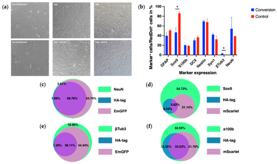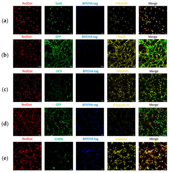Overall, 51.6% of mScarlet-expressing cells and 14.7% of EmGFP-expressing cells still expressed the HA-tag reporter, indicating partial retention of GFAP promoter activity in these reprogramming transitions. These findings are consistent with observations by Masserdotti et al. [29] who reported similar co-expression patterns in cells undergoing direct conversion from astrocytic to neuronal fates.