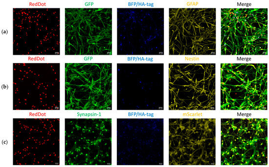 Among the reporter constructs, EmGFP driven by the Nestin promoter showed high expression within the GFAP-positive subpopulation, with approximately 79% of GFAP-positive cells also expressing Nestin. This observation is consistent with previous studies showing co-expression of GFAP and Nestin in cortical astrocytes of postnatal rodents [19,38,39,40].