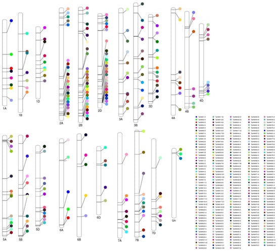 Chromosomal distribution of TaHMA genes on chromosomes 1–7 derived from each of the A, B, and D sub-genomes of T. aestivum. The localization of each gene is represented by an explicit color assigned to each gene ID.
