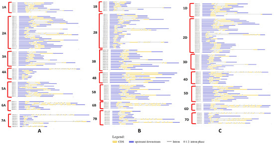 Illustration of the gene structure composition for various TaHMA genes in a sub-genome and chromosome-wise manner. (A)—TaHMA genes derived from the A sub-genome; (B)—TaHMA genes derived from the B sub-genome; (C)—TaHMA genes derived from the D sub-genome.