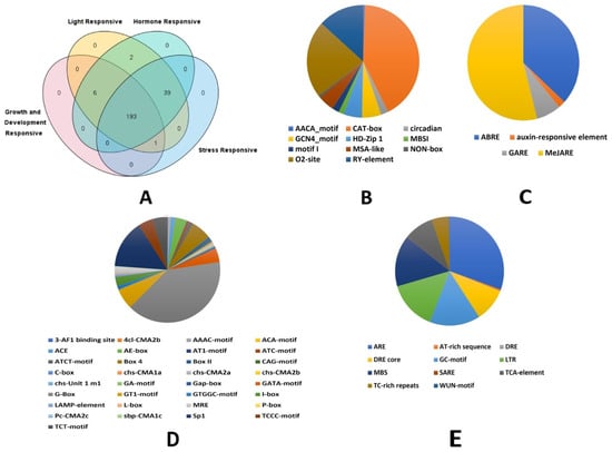 Cis-regulatory elements retrieved from the 1500 bp upstream region of the TaHMA genes. (A)—Venn diagram showing the category-wise prevalence of the cis-elements with 193 TaHMA genes harboring the entire category list. (B–E)—Pie charts showing the relative proportion of various elements recorded for growth and development, hormone responsiveness, light-sensitive, and stress-specific elements, respectively.
