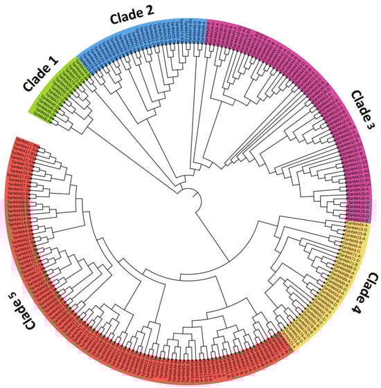 Phylogenetic tree constructed using full-length TaHMA protein sequences showing the evolutionary relationship. Five different clades represented by distinct colors correspond to the clade-wise domain composition as pictorially represented in Figure 5.
