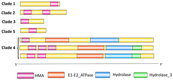 Domain composition analysis revealed majorly occurring domains for the TaHMA protein sequences, including HMA (pfam00403); E1-E2_ATPase (pfam00122); Hydrolase (pfam00702); and Hydrolase_3 (pfam08282). Five characteristic domain patterns were identified for all of the 243 TaHMAs, which coincided with the clade-wise distribution of the TaHMA proteins. For clades 1, 3, and 5, the majority of the TaHMA proteins belonging to each of these groups consisted of a single HMA domain, which in turn varied with respect to its location within the protein, i.e., either at the N or C terminus or somewhere within the two terminations. The rest of the TaHMAs fitted in clades 2 and 4 with the occurrence of one or more HMA domains, i.e., two and/or three in association with the characteristic domains for the HMAs, including E1-E2_ATPase, Hydrolase, and Hydrolase_3 (Figure 5). There were instances where we could not verify the occurrence of the HMA domain for certain TaHMA proteins through these popularly used domain servers. However, the ensemble database verified their identity as the proteins belonging to the HMA superfamily.