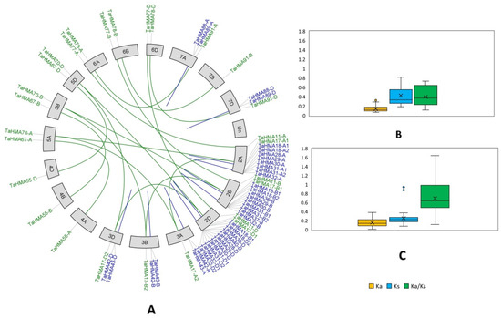 Gene duplication analysis for the TaHMA genes. (A)—Segmentally and tandemly duplicated gene pairs plotted using TBtools-II v2.154 in a Circos fashion represented by the green- and blue-colored lines, respectively. (B,C)—Box-and-whisker plots showing the distribution of Ka (orange), Ks (blue) and Ka/Ks (green) values obtained for the segmentally and tandemly duplicated gene pairs, respectively. Each box (encompassing whiskers) shows the median (central line), mean (cross on the box plot) and outliers. The Y-axis contains the values obtained for the Ka, Ks, and Ka/Ks.