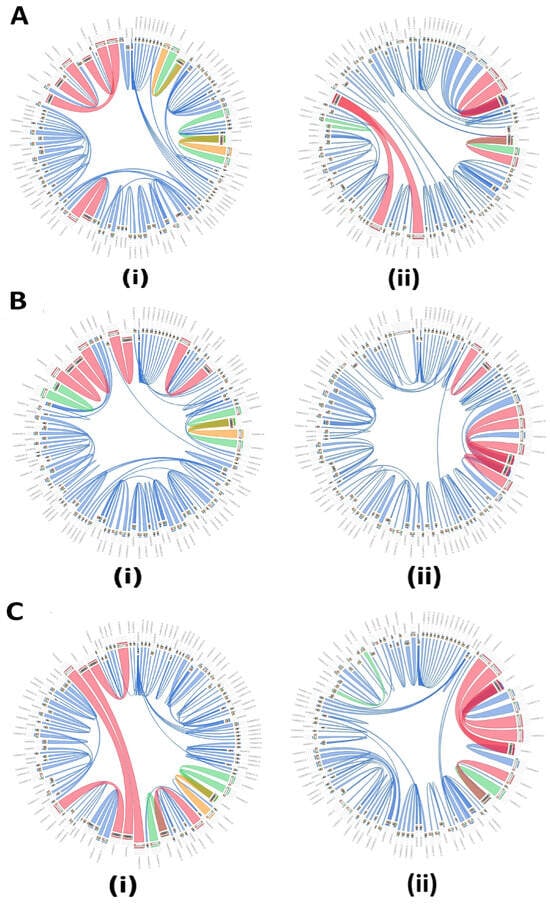 Circos-style plots obtained using the Circoletto tool to analyze the orthologous and/or syntenic relationship between the TaHMAs, OsHMAs, and AtHMAs. (Ai,ii–Ci,ii)—Syntenic plots constructed using the full-length amino acid sequences of AtHMAs and OsHMAs, with the TaHMA proteins specific to the A, B, and D sub-genomes, respectively.