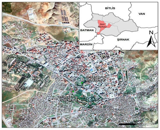 Location map of Siirt: (A) sampling station; and (B) weather station.