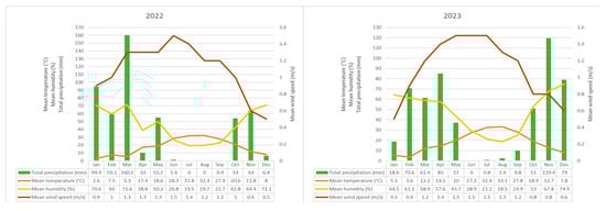 The meteorological parameters recorded during the study years—including relative humidity, temperature, precipitation, and wind speed, are summarized in detail in Figure 3.