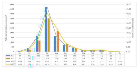 Monthly variation in airborne pollen concentrations in Siirt during 2022 and 2023. Values (%) represent annual mean percentages. Asterisks (*) indicate data from 2022 and 2023, respectively.