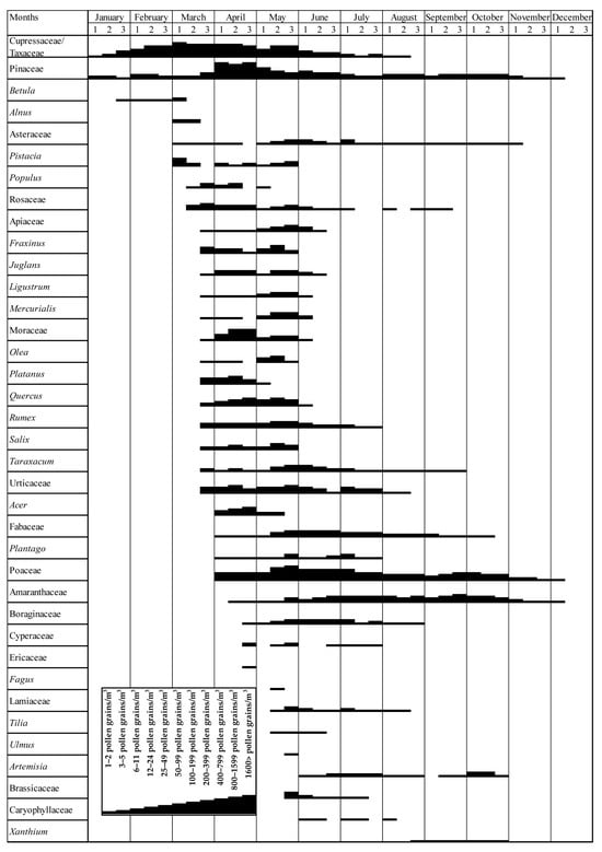 Pollen calendar for dominant taxa based on REA thresholds. Numbers 1, 2, and 3 indicate the first (days 1–10), second (days 11–20), and third (days 21–end) ten-day periods of each month, respectively.