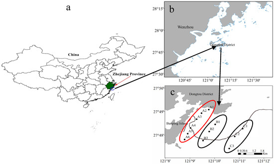 Sampling locations on Dongtou Island, China. (a) Location of Zhejiang Province in China. (b) Map showing Wenzhou and Dongtou District. (c) Distribution of sampling sites. A: cultivation area (stations A1–A6); B: adjacent area (stations B1–B3); C: control area (stations C1–C3).