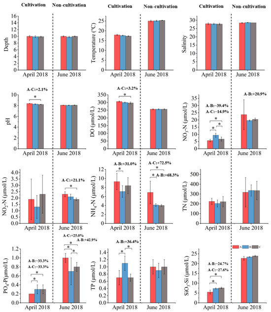 Temporal and spatial characteristics of environmental variables in 2018 (mean ± SD, n = 6). A: cultivation area, B: adjacent area, C: control area. (*) indicates significant differences (p < 0.05) between areas “B” or “C” and area “A”. Values on the figure indicate the relative percent decrease of the measured parameter in the cultivation area (A) compared to the adjacent area (B) and control area (C).