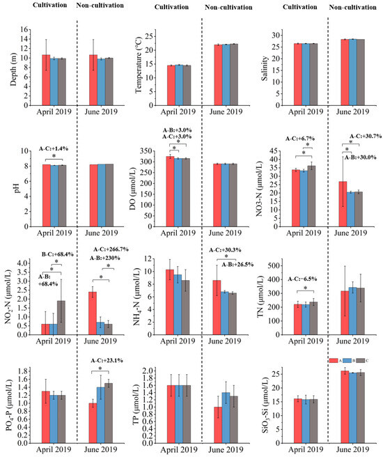 Temporal and spatial characteristics of environmental variables in 2019 (mean ± SD, n = 6). A: cultivation area, B: adjacent area, C: control area. (*) indicates significant differences (p < 0.05) between areas “B” or “C” and area “A”. Values on the figure indicate the relative percent decrease of the measured parameter in the cultivation area (A) compared to the adjacent area (B) and control area (C).