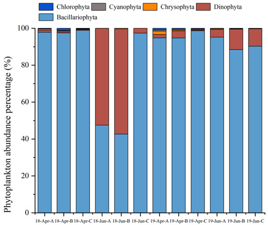 Phytoplankton abundance of each phylum at different sampling times (%). Note: Abbreviations follow the format “YY-MMM-X”, “YY” refers to the year (18 = 2018, 19 = 2019); “MMM” refers to the sampling month (Apr = April, Jun = June); “X” refers to the sampling area (A: cultivation area, B: adjacent area, C: control area).